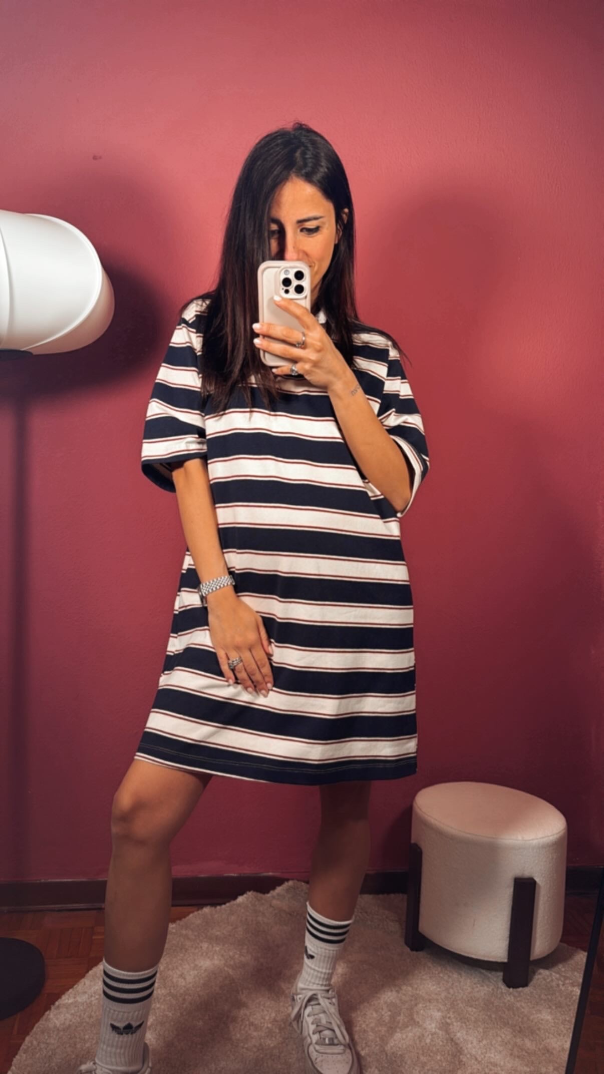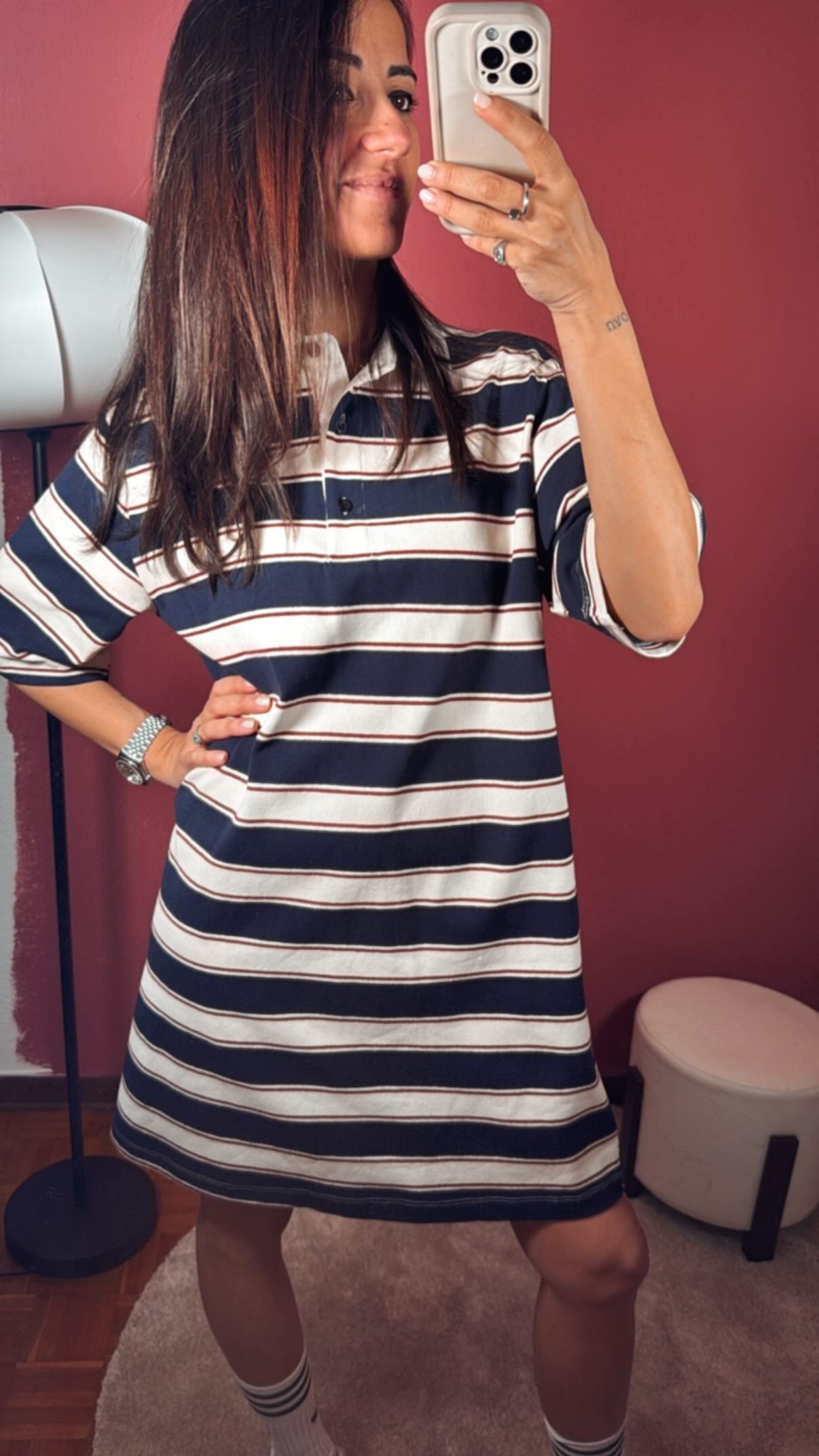 Abito a righe blu, bianco e bordeaux, con maniche ampie e collo a polo bianco.